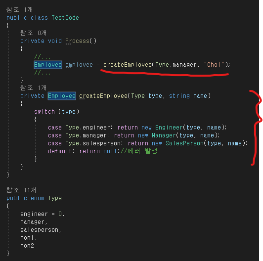 2) 매개변수로 받은 Type와 방금 만든 서브클래스를 매핑하는 선택 로직(switch문)을 제작한다.