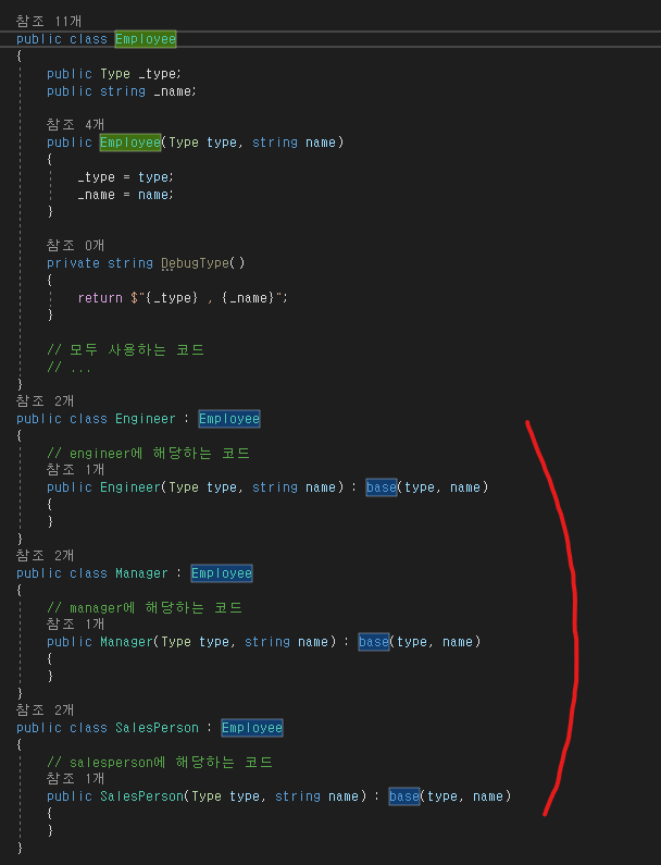 1) 타입코드 값 하나를 선택해서 서브 클래스를 제작한다.