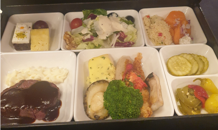스테이크 / 생연어 / 샐러드 / 생선구이 / 전복 먹고 왼쪽상단에 초코케이크로 후식 먹었습니다