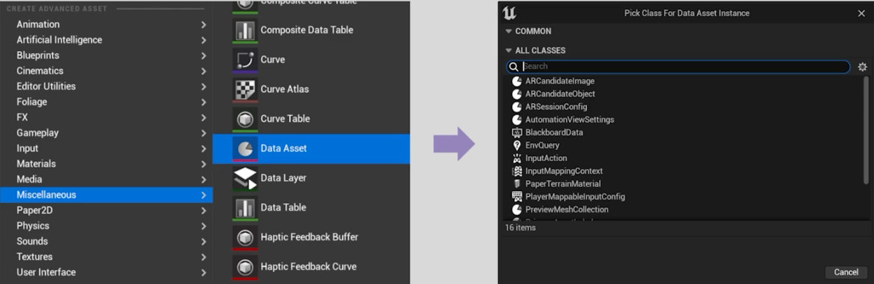스크립트로 데이터 폼을 제작했다면 Editor에서 DataAsset을 제작할 수 있음.