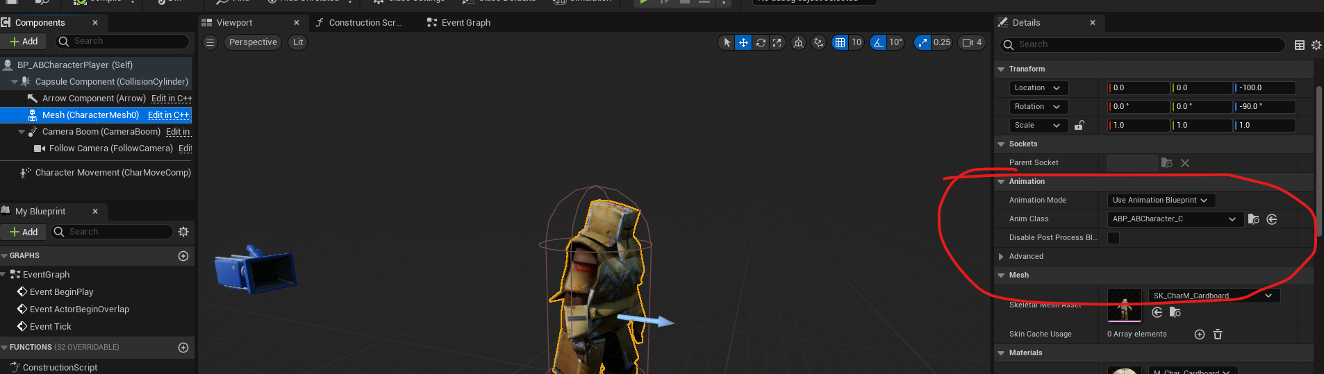 블루프린트를 사용할 꺼고, 애님 클래스는 ABP_ABCharacter_C 를 사용한다고 적혀있다.