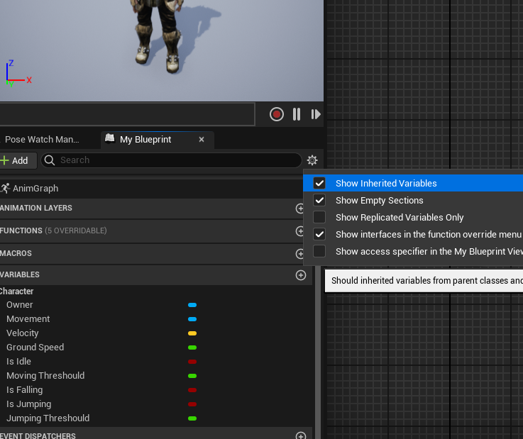 이후 제작한 Anim Instance 블루프린트로 가서 Show Inherited Variables를 누르면 상속받은 변수들을 볼 수 있다.