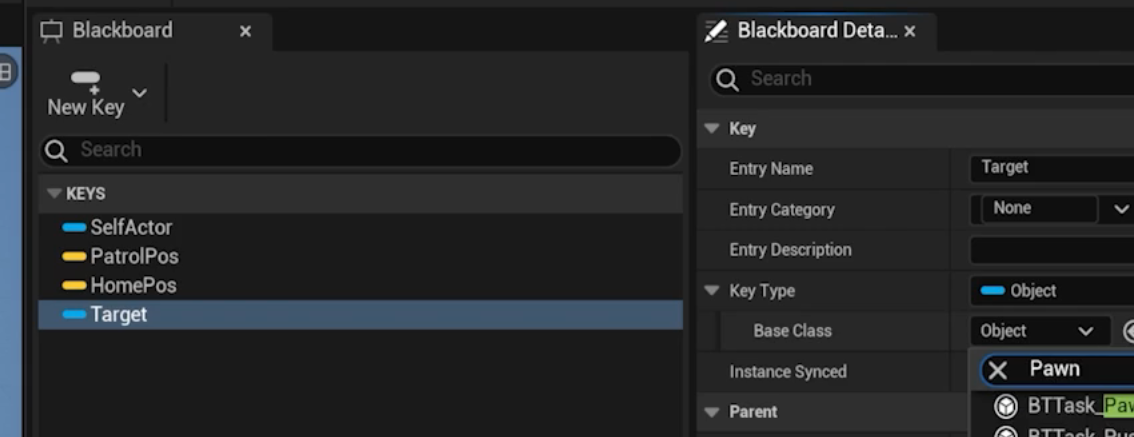 이후 Blackboard에서 Target이라는 Object타입을 추가해준다. (Base Class는 Pawn)