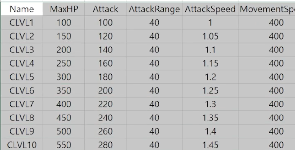 엑셀의 Name 컬럼을 제외한 컬럼과 동일하게 UPROPERTY속성을 선언하고 csv를 언리얼 엔진에 임포트한다.