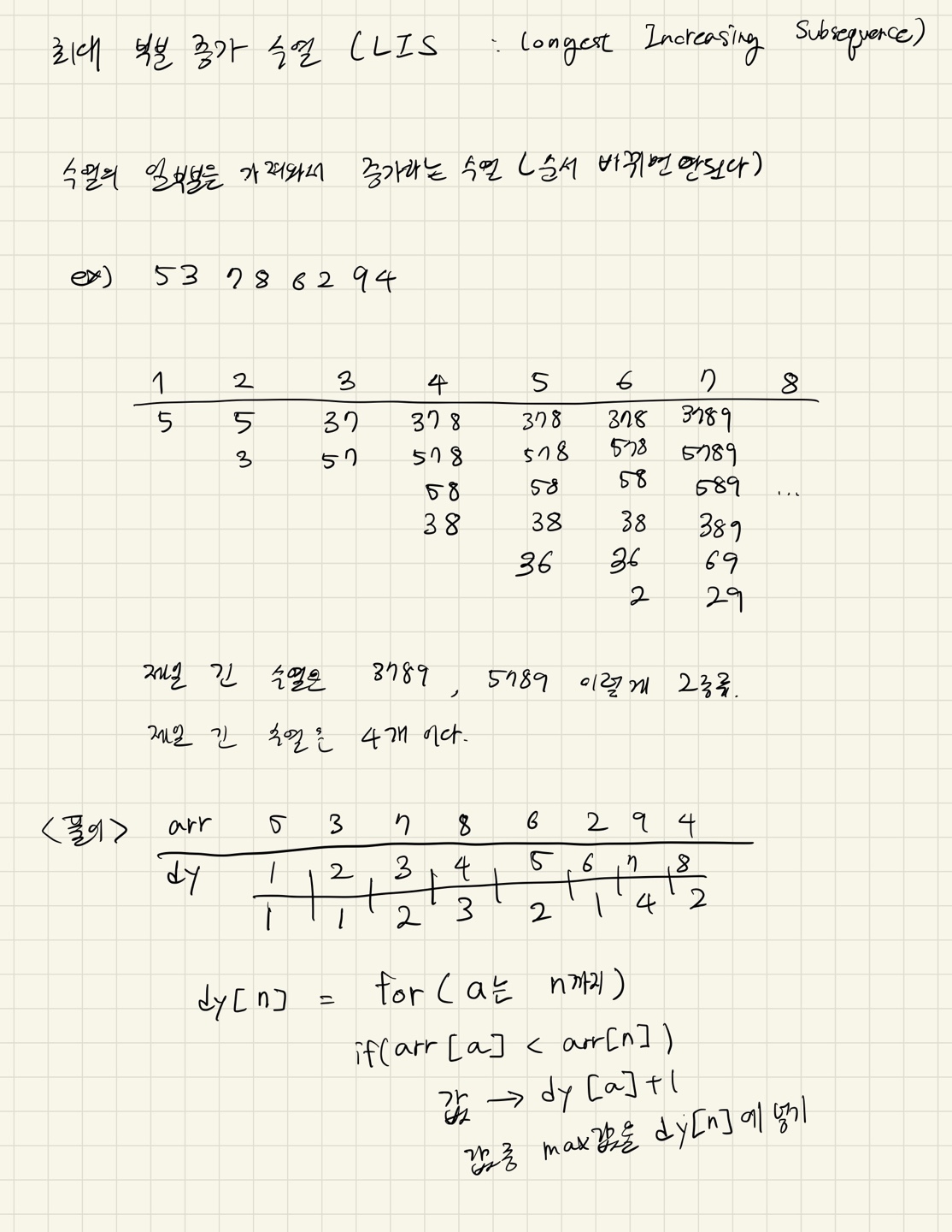 - 이를 통해 i번째 원소를 끝으로 하는 LIS의 최대 길이를 구할 수 있다.