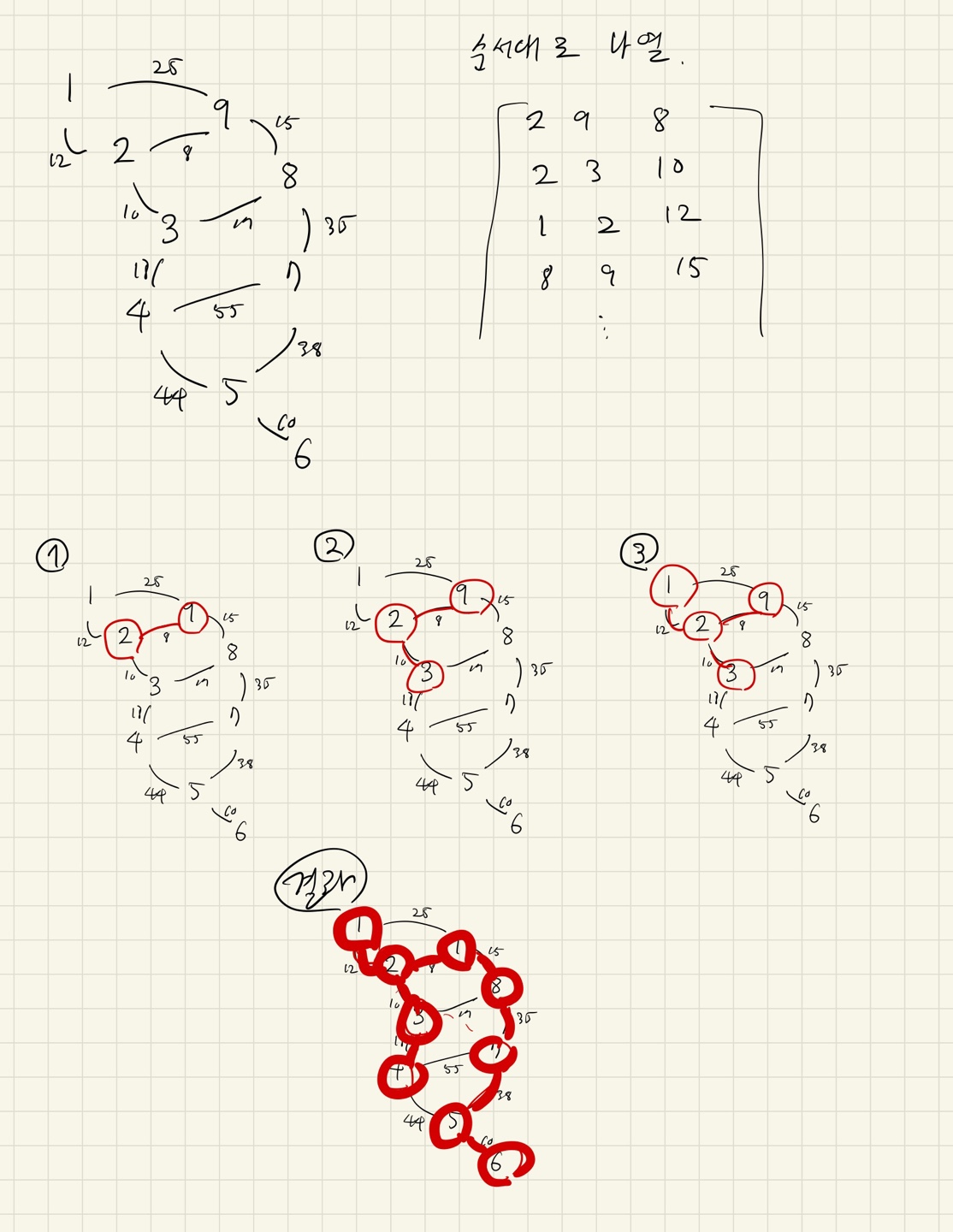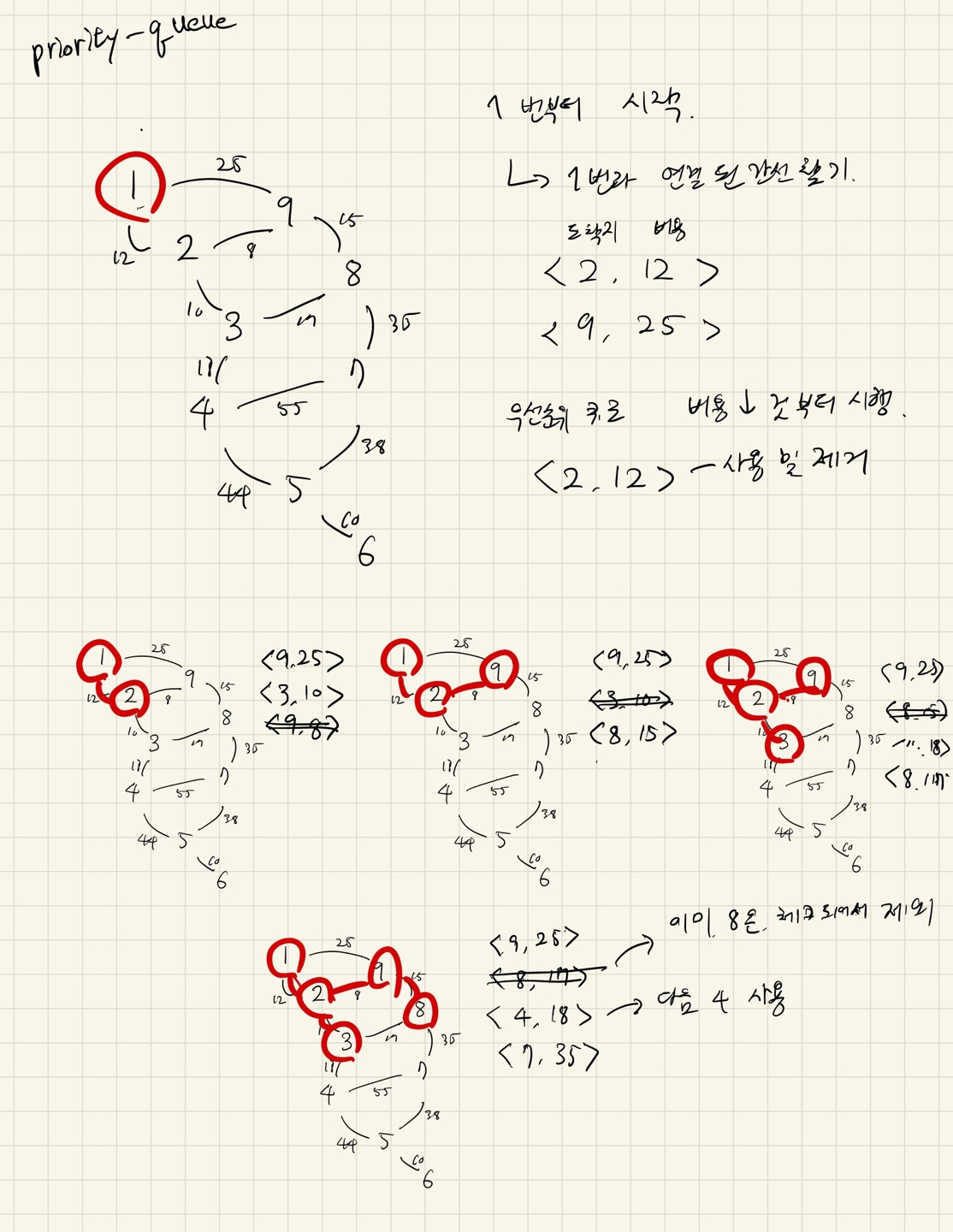 어찌되었든 오름차순으로 정렬하기 때문에 우선순위 큐에 넣고, 노드 하나를 기준으로 연결해 나아가는 방식이다.