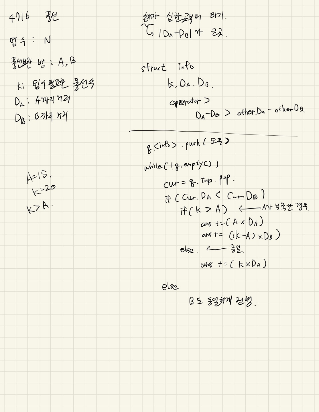 이것도 예전에 풀었던 트럭문제랑 비슷하더라. 손해를 가장 많이 보는곳 기준으로 우선순위 내려서 풀었다.