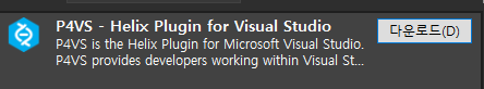 우선 Visual Studio를 키고, 메뉴바에 확장 매니저를 통해 p4vs를 다운받고 실행해야 합니다.