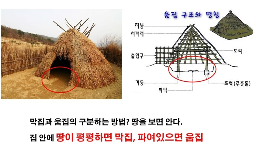 | 구석기 | 돌이나 바위따위를 때려서 부셔서 만든 도구들을 사용 - 주먹도끼, 찍개, 슴베찌르개, 동굴, 막집(바닥이 평평), 사냥, 채집 |